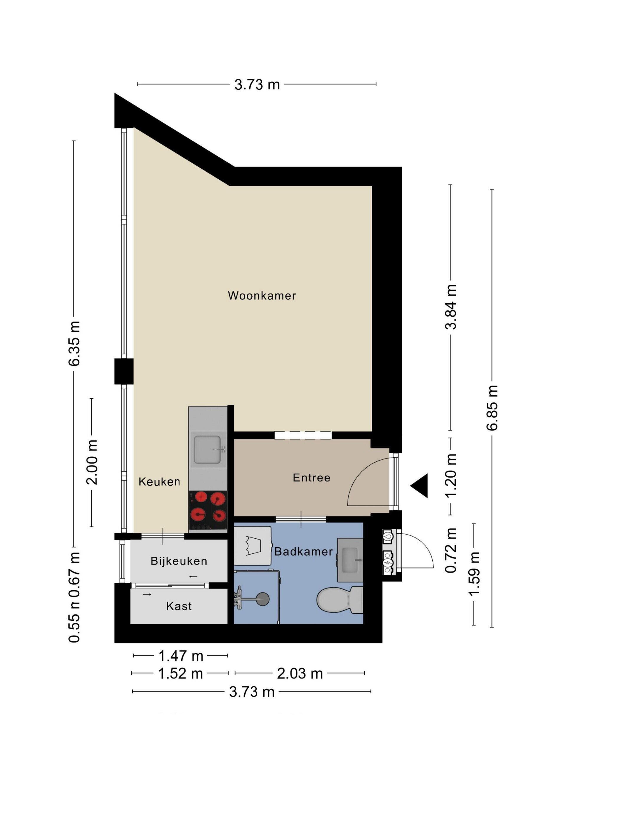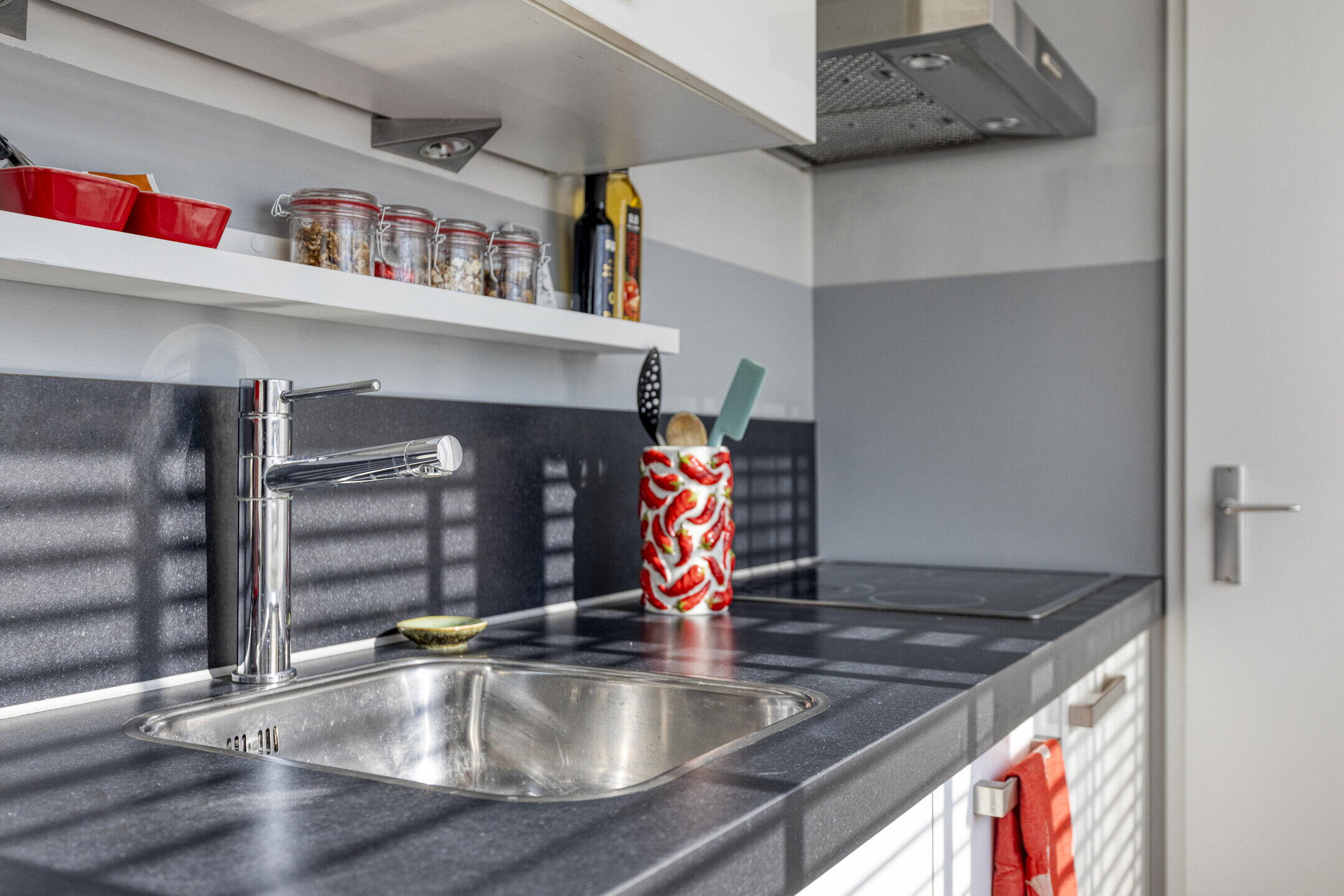 Derde verdieping: galerij naar privé-entree. Hal met doorloop naar de woon-slaapkamer. In het verlengde van deze ruimte bevindt zich ook de compleet uitgeruste keuken met ingebouwde kookplaat, afzuigkap, vaatwasser en koelkast. Aansluitend een bijkeuken en een vaste (provisie)kast. Natuurlijk is er ook een eigen badkamer met (inloop)douche, wastafelmeubel en toilet; tevens hier de aansluiting voor de wasmachine.